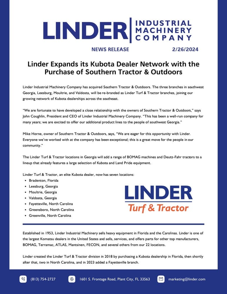 Linder Industrial Machinery Company has acquired Southern Tractor & Outdoors. The