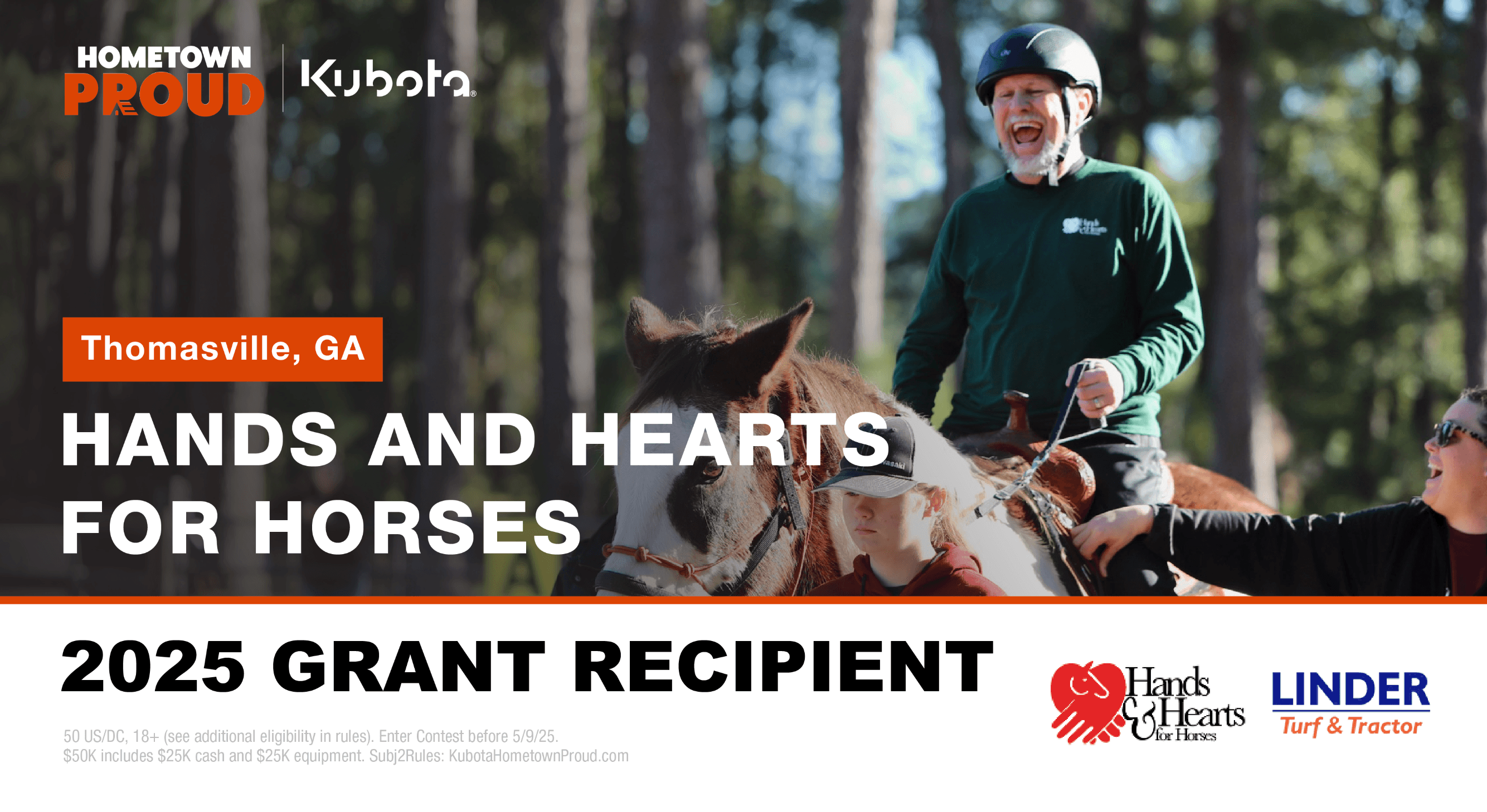 Hands & Hearts for Horses is an organization that provides therapeutic riding therapy at its 26-acre horse farm located in Thomasville, Ga. Impacting over 500 volunteers, participants, and their families from 14 counties, this organization supports rising capacity demand and provides an invaluable resource to their local community. With the Kubota Hometown Proud grant and the support from the